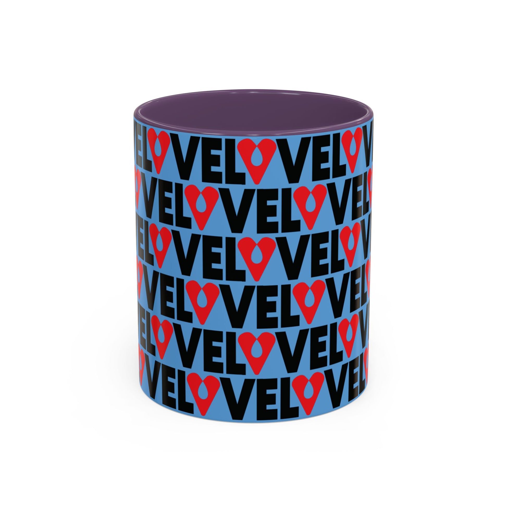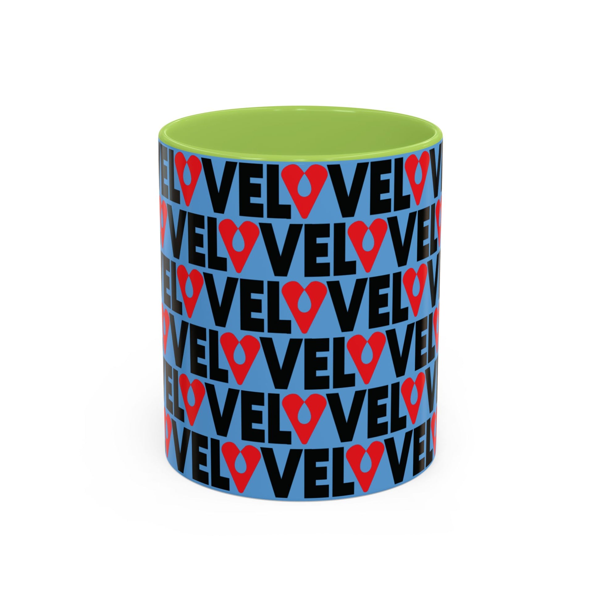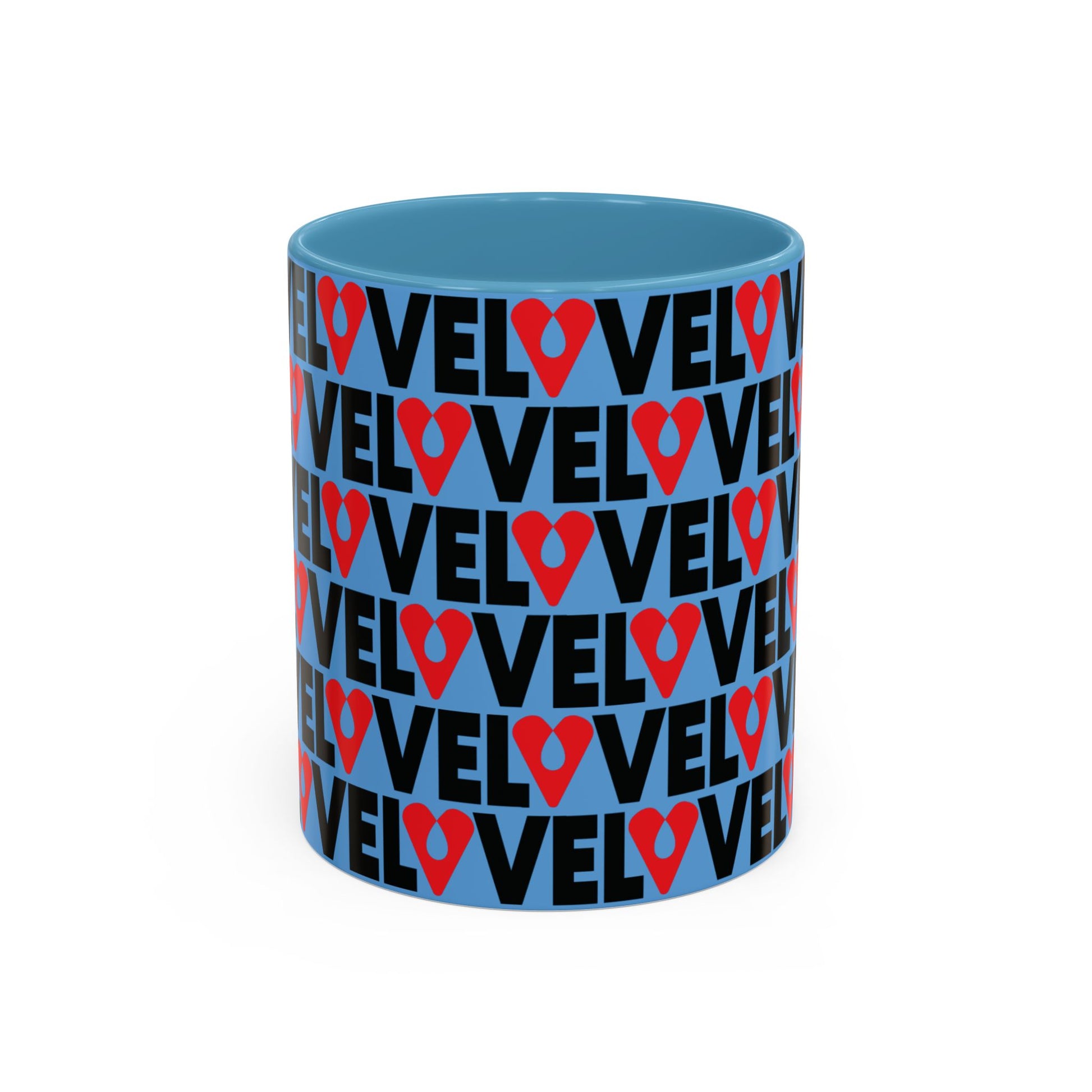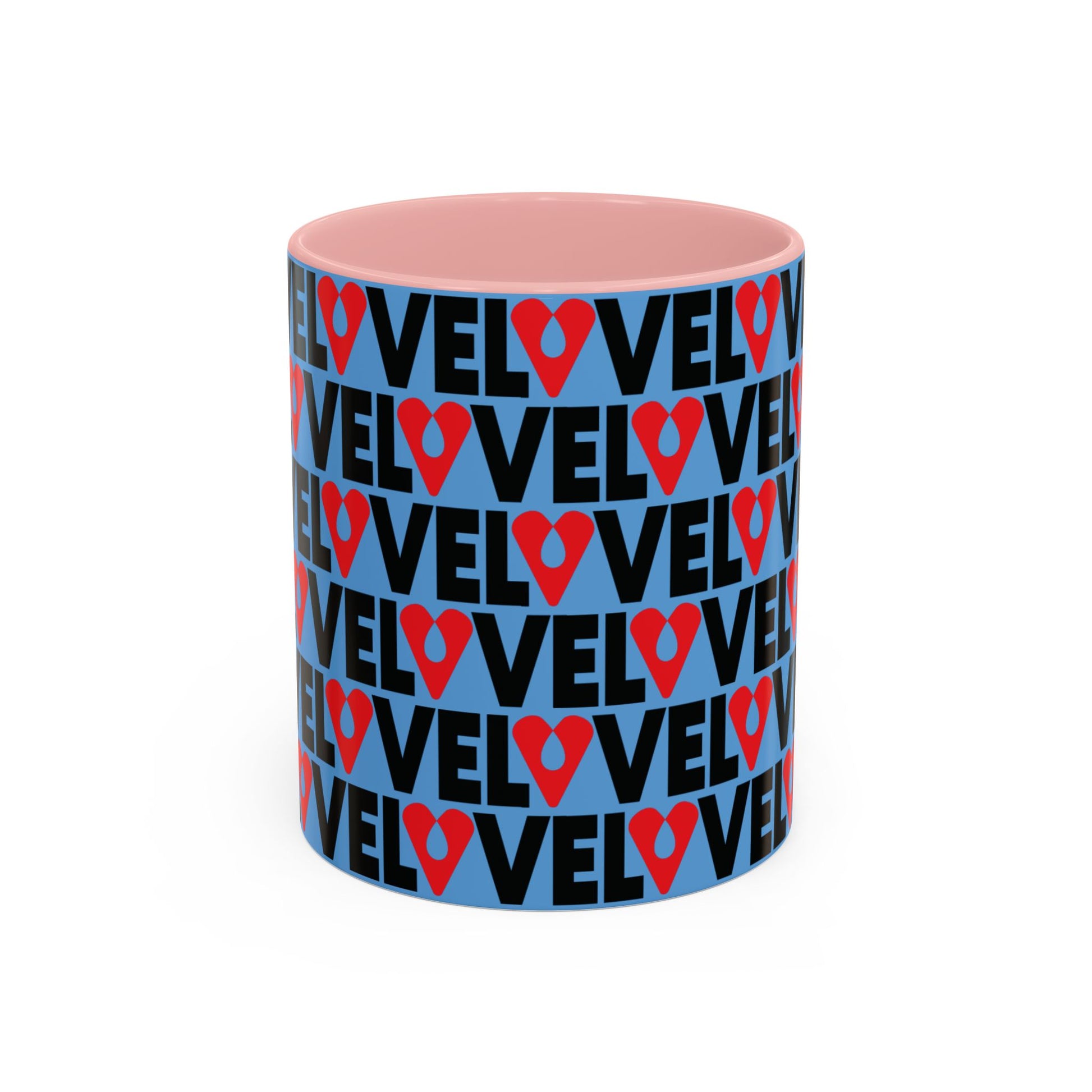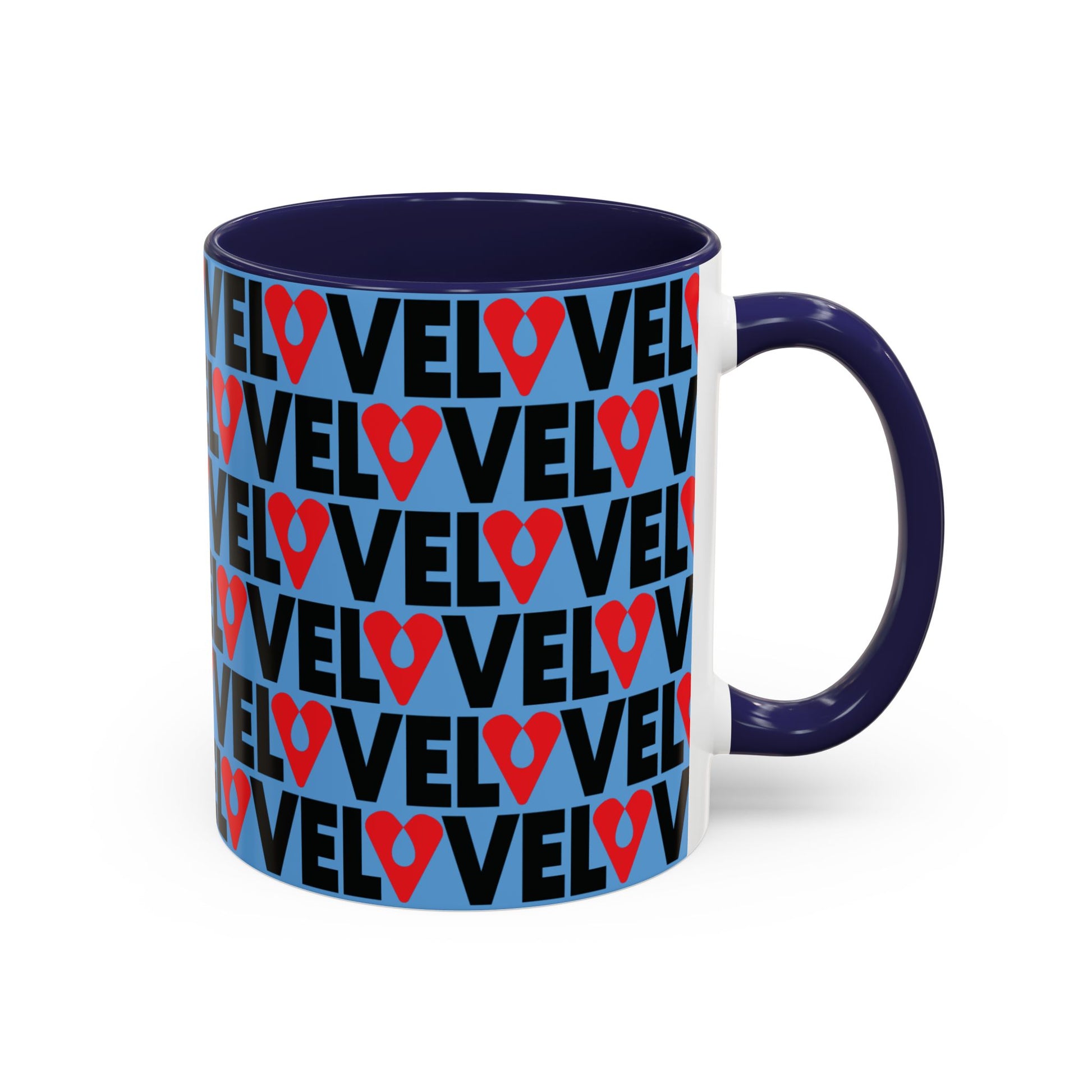 This ceramic mug features a refined wraparound LOVE graphic — repeating “LOVE” typography punctuated by a heart-shaped location pin — creating a modern urban statement with depth and rhythm. The vivid red interior and handle contrast against the clean white ceramic, delivering a high-impact yet curated aesthetic.